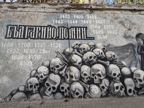 A wall painting of a figure shrouded in black, mourning among a pile of skulls. This is a strong visual representation commemorating victims of a tragic event or period in history. The dates written on the wall correspond to significant battles or events in Bulgarian history, many related to struggles against the Ottoman Empire. It's a powerful mural meant to provoke reflection on the past and the sacrifices made for Bulgaria's future.